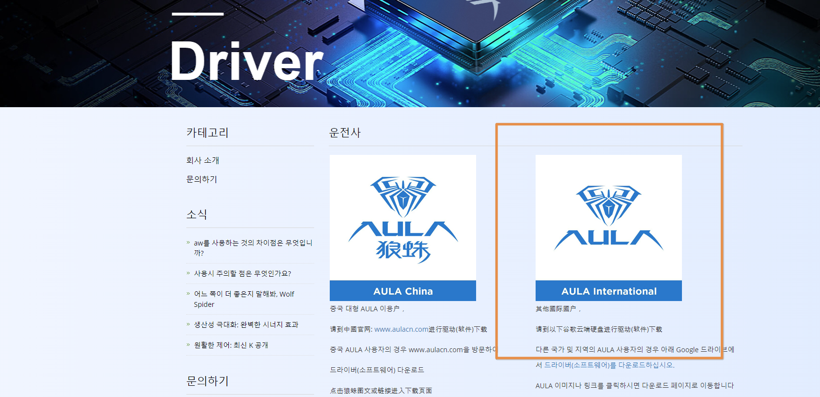 - AULA 홈페이지 접속 후 상단 드라이버 탭 진입.