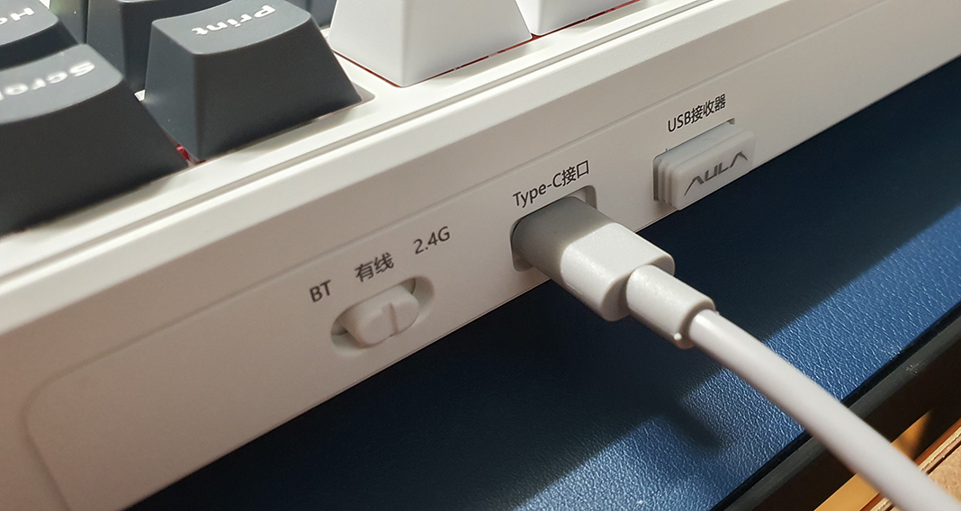 독거미 키보드 상단에 보면 BT, 有线(유선), 2.4G 이렇게 3가지 모드 변환 스위치가 있습니다. 유선(有线)이라는 글자는 중국어로 표기되어 있네요. 연결 잘해놓고 상단에 스위치 설정 안 해서 안된다고 하시는 분들 계시죠? 반드시 상단의 스위치 모드 조정해 주셔야 합니다!